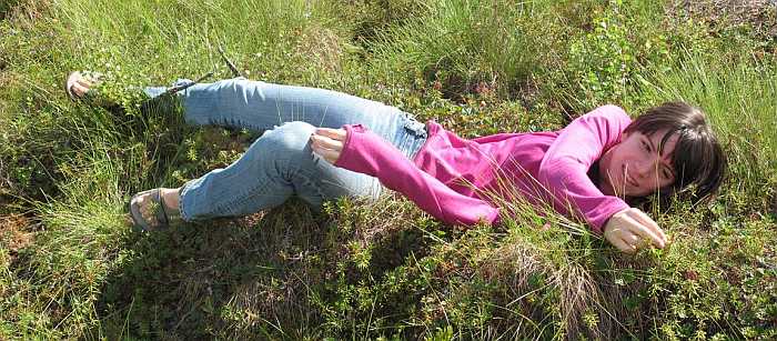 Here she is (at right) providing scale for a burl, and (below) testing the softness of local tundra.